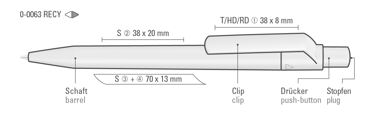 Druckkugelschreiber mit gedeckt mattem Gehäuse, Clip, Drücker und Stopfen aus 100% recyceltem Post-Consumer-Kunststoff. Das Modell ist mit dem Recyclingzeichen gekennzeichnet. Drücker und Stopfen optional in verschiedenen gedeckt glänzenden Farben (Standard ABS) erhältlich. Aufgrund der Besonderheit des Materials (Post-Consumer Recycled Plastic) sind produktionstechnische Farbschwankungen gegeben.Marke: