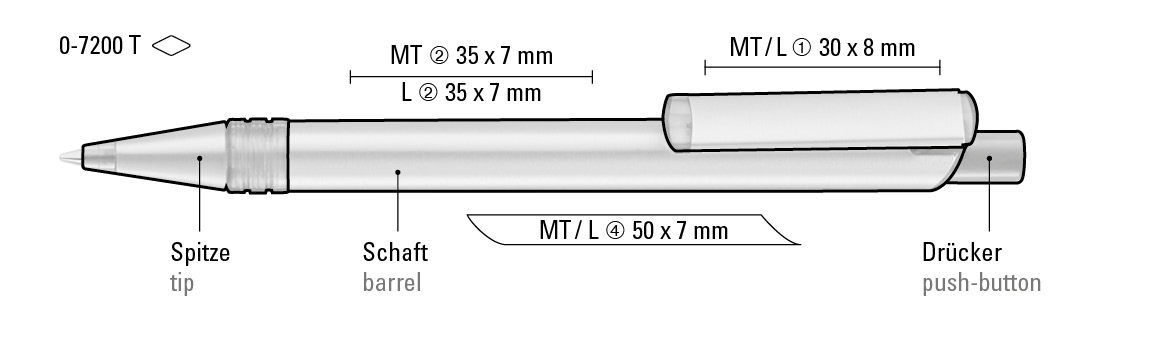 - Definieren Sie die Positionierung und Farben (Pantone-Angabe). Für das optimale Druckergebnis empfehlen wir bei einigen farbigen, transparenten und gefrosteten Schreibgeräten, den Vordruck eines weißen Untergrunds (d.h. eine zusätzliche Farbe vorab). Bei diesen Modellen sind übrigens stark deckende, kräftige Farbtöne ideal für die perfekte Wirkung des Druckbilds.